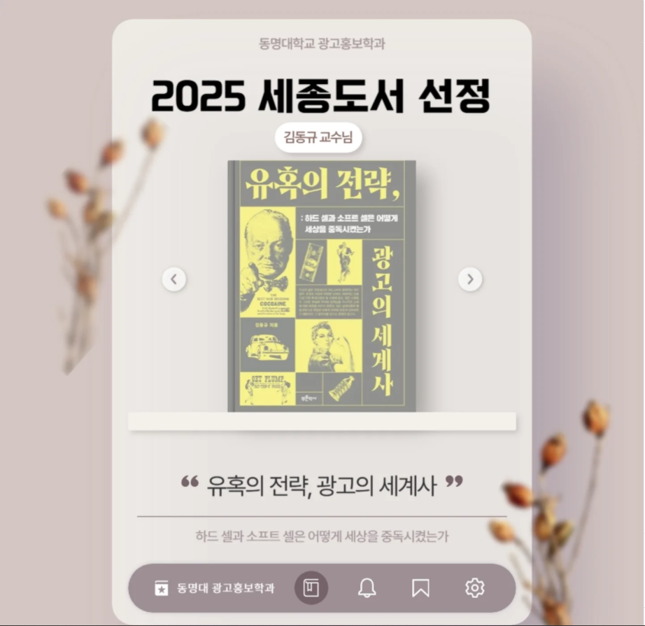 📣 김동규 교수님의 저서 <유혹의 전략, 광고의 세계사>가 2025 세종도서(사회과학 부문)에 선정됐습니다.✨️🎉👍 김동규 교수님의 학술 역량이 인정받은 건데요. 동명대 광고홍고학과의 경사가 아닐 수 없습니다. 축하드립니다. 김동규 교수님!!