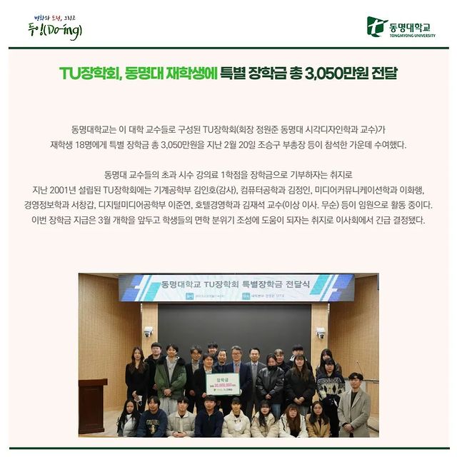 지난 2월 20일, 우리 학과 학회장 고지수 학생이 TU장학회 장학생에 선정됐다는 내용이 학교 카드뉴스로 나왔네요. 축하합니다.