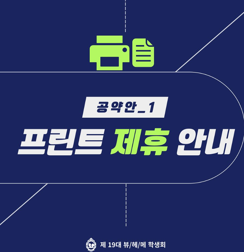첫 번째 공약안인 ‘프린트 제휴’는 학과회비 안에 일정한 금액을 포함시킴으로써 시간적•금전적 부담을 덜어드릴 수 있고, 학과 소속감 증대를 위해 금일부터 공약안을 다음과 같이 실행합니다!