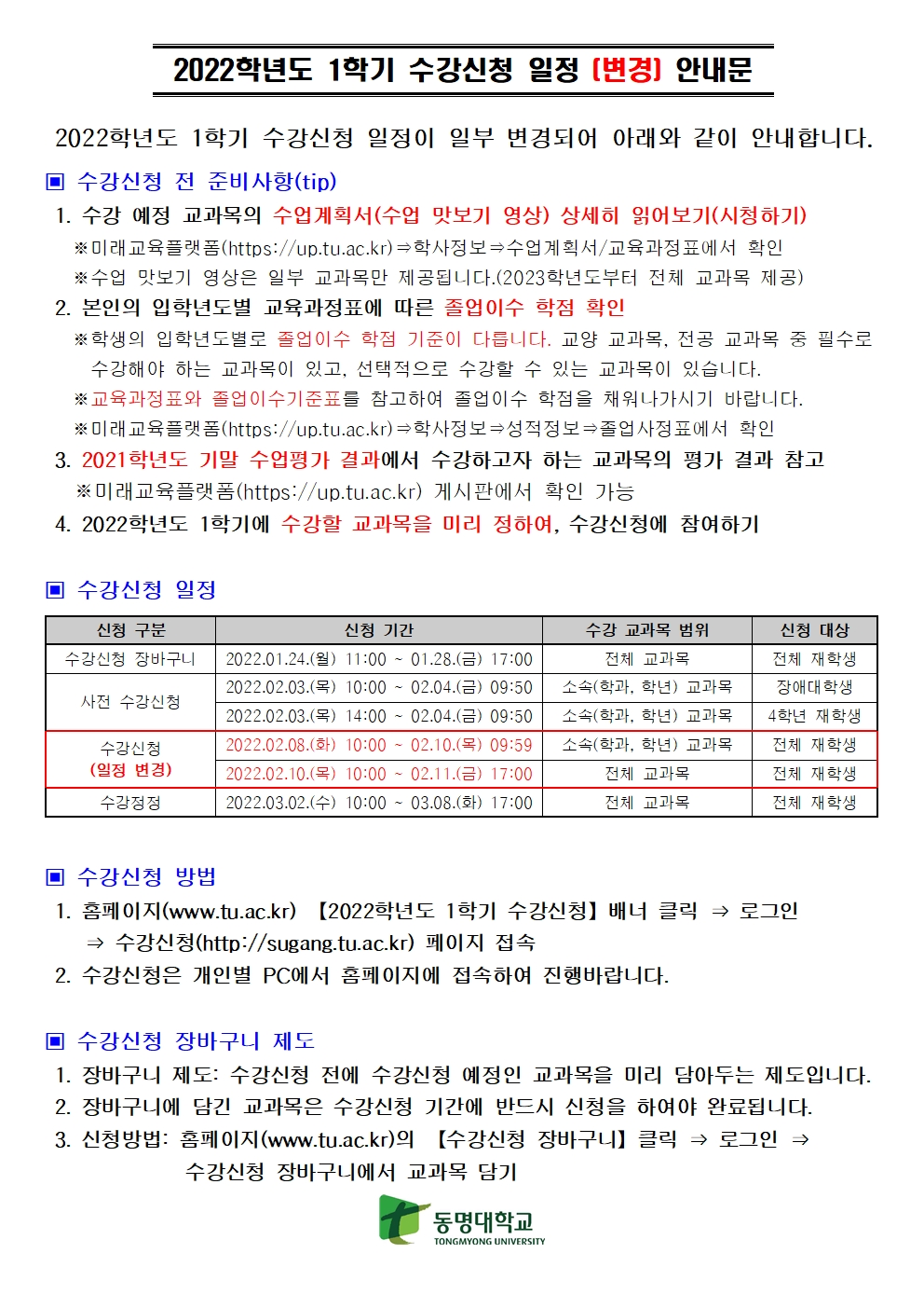 2022학년도 1학기 수강신청 일정 안내