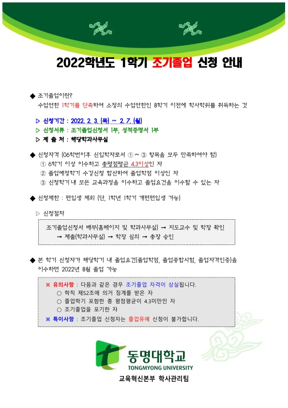 2022학년도 1학기 조기졸업 신청 안내