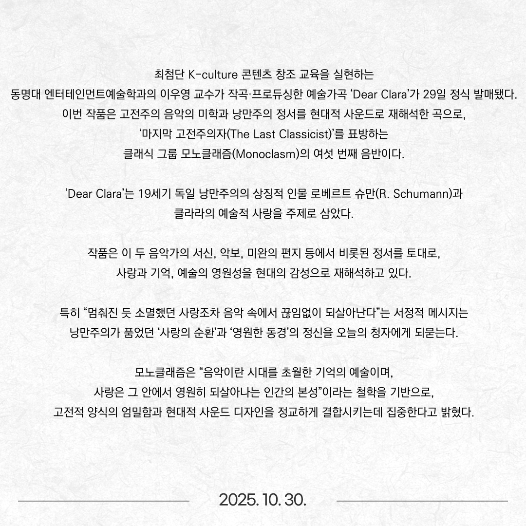 동명대 이우영 학과장, Monoclasm 'Dear Clara' 프로듀싱, 음반 발매