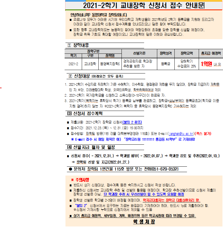 2021-2학기 동명복지장학C 장학금 신청서 접수 안내