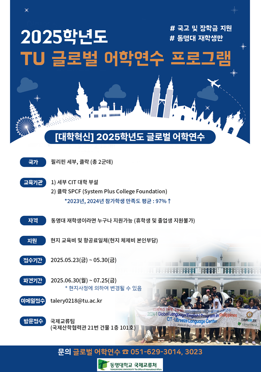 국제교류처에서 2025. 05. 23(금) ~ 2025. 05. 30(금)까지 하계 TU글로벌 어학연수 지원자를 모집하고 있습니다.