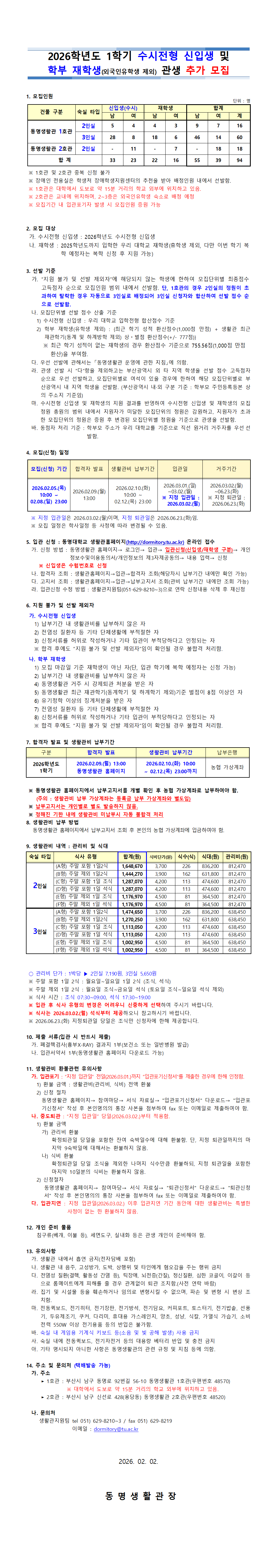 2026학년도 1학기 생활관 관생모집 안내_정시모집 신입생 + 신입학 편입생