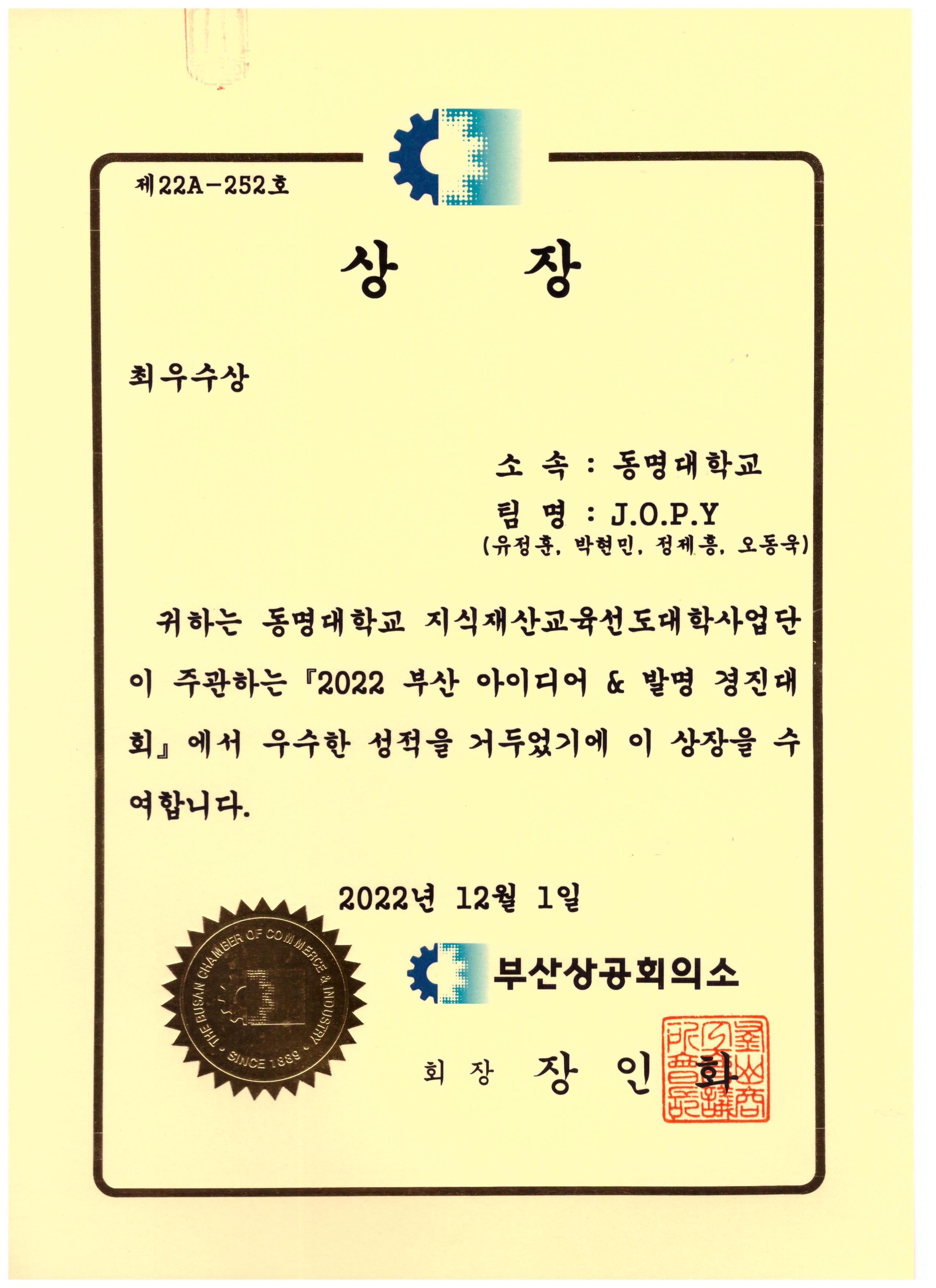 [2022.12.01(목)] 2022 부산 아이디어 & 발명경진대회 최우수상 수상
