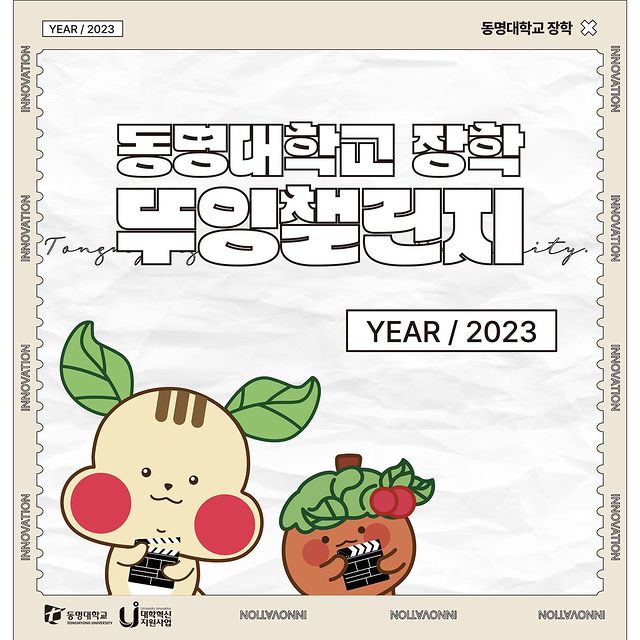 2026학년도 TU-이노베이터(6기)를 모집합니다. 모집인원: 4명(영상 2명, 디자인 2명) TU-이노베이터란? “동명대학교의 대학혁신전략을 홍보하고 대학혁신지원사업과 동명대학교의 성공을 위하여 대학과 학생을 연결하고 대학과 세상을 연결하는 창의적 혁신리더” ☆ 지원자격 - 동명대학교 학부과정 학생으로 대학혁신지원사업 및 서포터즈 활동에 관심이 많은 자 - 지원분야 콘텐츠 제작기술을 보유하여 기획/제작이 가능한 자 - 팀 프로젝트나 대외활동에 참여한 경험이 있거나 관심이 많은 자 - 책임감 있게 활동을 완수할 수 있는 자 - 애교심 및 업무 수행에 열정이 많은 자 ☆ 활동혜택 - 임명장, 수료증, 활동증명서 (필요시) - 장학금(활동비), 모범/우수 이노베이터 선발 시 상장 및 시상금 - 비교과 마일리지 5점 - 콘텐츠 제작관련 프로그램 툴/디자인 소스 지원 - 홍보 활동 비용 전액 지원(단, 식비 등은 불가) ※ 장학금(활동비): 시간당:10,320원으로 측정 (월 최대 20시간) ※ 근로장학금을 받는 학생은 지원 불가 ※ 기존 교내 서포터즈 활동 중복 지원 불가 ☆ 이노베이터 활동 관련 궁금한 점 - 대학본관(1번건물) 209호 재정혁신팀 방문 (관련 책자 열람 가능) ----- (접수방법) 전자우편 또는 직접제출 ----- - 전자우편(E-mail)를 통해 신청: giung999@tu.ac.kr - 직접제출: 동명대학교 대학본관 209호 재정혁신팀 제출서류: 상단 붙임파일 신청서(한글파일), 추가 필요 시 제출자료(영상 포트폴리오, 디자인 포트폴리오) (신청기간) 2026.03.16.(월) ~ 3.25.(수) 15:00시 까지 관련문의: 051-629-0624 / 010-8592-6216(내선번호 부재시)