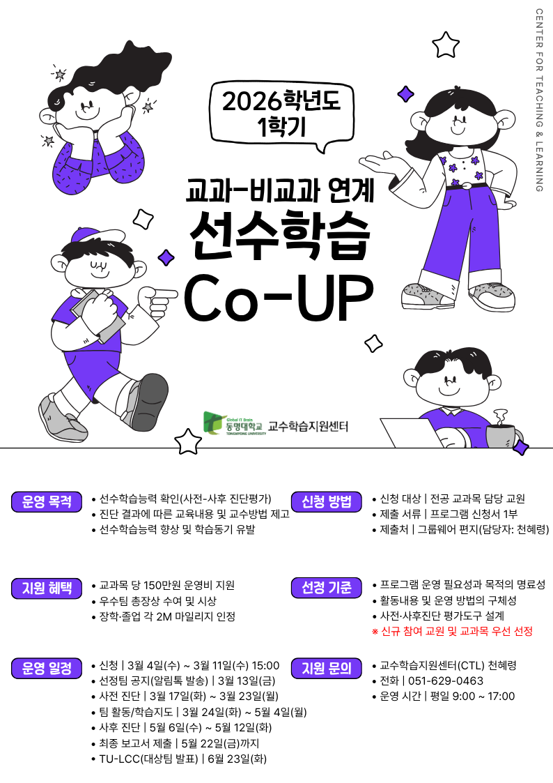 동명대학교에서는 「TU 부산형 AI·DX 융합인재 틔움사업」의 원활한 운영을 위해 학과 단위 AI·DX 교육 및 비교과 프로그램을 책임 있게 운영할 AI·DX 전담교수를 아래와 같이 모집하오니 많은 참여 바랍니다. 1. 사업 개요 • 사 업 명: TU 부산형 AI·DX 융합인재 틔움사업 • 사업기간: 2026. 4. ~ 2028. 2. • 사업목표 - AI·DX 기반 디지털 헬스케어 및 스마트복지 분야 실무형 융합인재 양성 - 「틔움 4S(Seed–Sprout–Step up–Spread)」 단계 기반 교육–현장–실증 연계형 인재양성 체계 구축 2. 모집 개요 • 모집대상: 학과 소속 전임교원 • 모집인원: 학과별 1명 • 임 기: 2년 (2026. 4. ~ 2028. 2.) • 선발방식: 신청 → 심사 → 총장 위촉 3. 주요 역할 • AI·DX 기반 전공 연계 비교과 프로그램 기획 및 운영(S2 단계) • 교수–학생 스터디 운영 및 학생 지도(S2 단계) • 특강, 학술대회, 박람회, 자격과정 등 프로그램 참여 지도 • 지역 스마트복지 및 디지털 헬스케어 현장 연계 4. 지원 및 혜택 • 활동비: 월 100,000원 • 기타: 업적평가 반영, 비교과 프로그램 운영 지원 5. 신청 방법 • 제출서류: AI·DX 전담교수 지원서 1부 • 제출기한: 2026. 4. 9.(목)까지 • 제 출 처: 대학혁신단 재정혁신팀 박예슬(이피스 전자메일 제출) 6. 선정 기준 • 사업 이해도 및 참여 의지 • 전공과 AI·DX 연계 가능성 • S2 단계 운영계획 구체성 • (특강, 자격과정, 스터디 운영 등) 문의: 대학혁신단 재정혁신팀 담당자 박예슬(내선 0625) 붙임 1. AI·DX 전담교수 모집 공고 계획 1부. 2. AI·DX 전담교수 지원서 1부. 끝.
