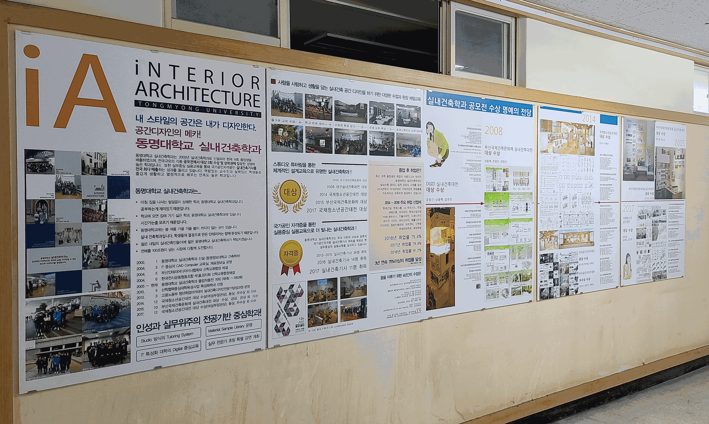 전국 공모전에서 수상한 작품을 전시하는 명예의 전당 복도 갤러리 공간. 대상 수상 작품에서 최우수상, 우수상에 이르는 국내 최고 수준의 동명대학교 실내건축학과 학생들의 작품을 전시.