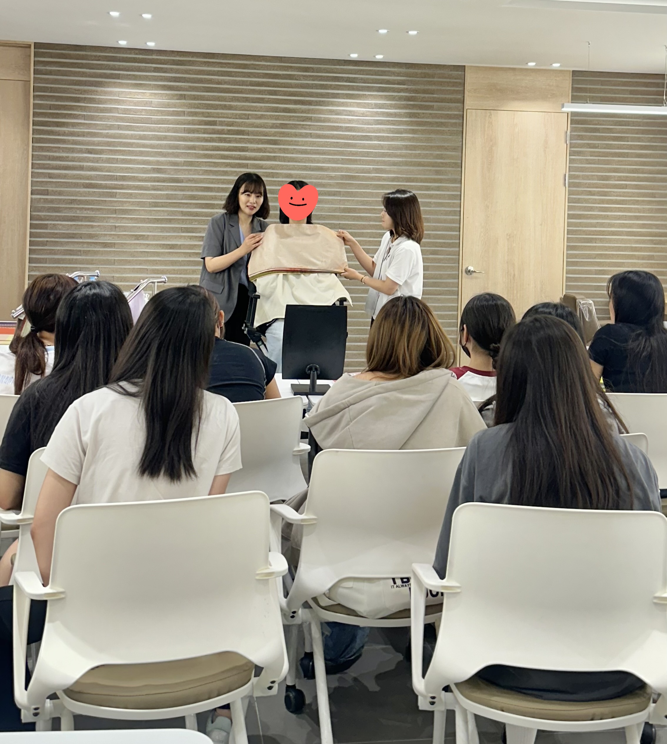 최혜민 교수는 드레이핑 천을 활용해 어떤 컬러가 얼굴 이미지에 어울리는지 비교하며 설명해주었고, 학생들은 베스트 컬러와 워스트 컬러의 차이를 시각적으로 확인하며 높은 흥미를 보였습니다.