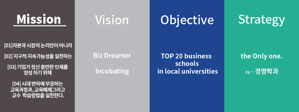 우리 학생들이 비즈니스 분야에서 자신의 꿈을 마음껏 펼칠 수 있도록 미래사회가 요구하는 실천역량을 함양하여 소속 조직과 사회에서 체인지 메이커가 될 수 있도록 육성한다는 의미를 담아서 학과 비전을 ’Biz Dreamer 인규베이팅‘으로 정립하였다. 또한 비전 실천지향을 통해 2026년까지 5개년 계획의 발전목표를 ’Top 20 business schools in local universities’ 로 설정하였디.