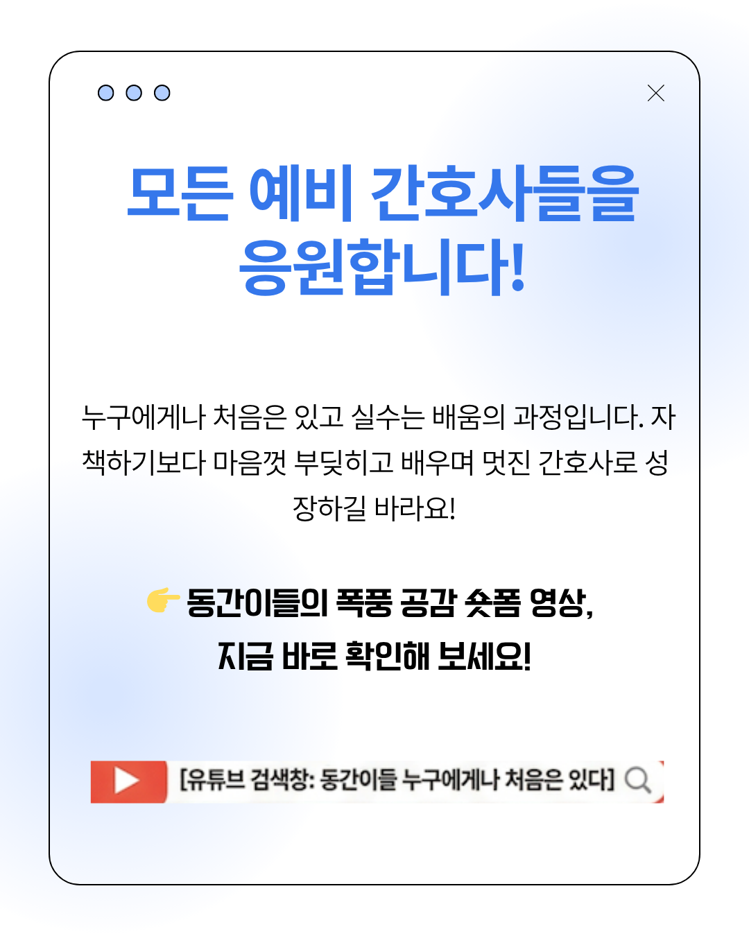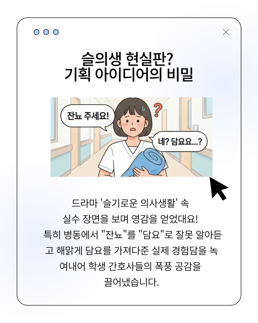 누구에게나 처음은 있다 🩺💙그리고 그 처음은… 생각보다 더 서툴고, 더 떨리고, 더 진짜다실수로 웃음만 주는 게 아니라그 안에 있는 두려움, 책임감, 그리고 성장까지 담아낸 이야기“잔뇨 주세요”에 “네? 담요요…?” 했던 그 순간처럼우리 모두 한 번쯤은 겪었을 ‘찐 현실’하지만 혼자가 아니라는 거선배와 동료가 있다는 거그게 결국 우리를 간호사로 만들어가는 과정인 것 같아👉 누구에게나 처음은 있고,그 처음은 결국 ‘성장’으로 이어진다동간이들의 공감 200% 숏폼 영상,지금 바로 확인해봐요 🎬#간호학과 #간호학생 #간호실습 #임상실습