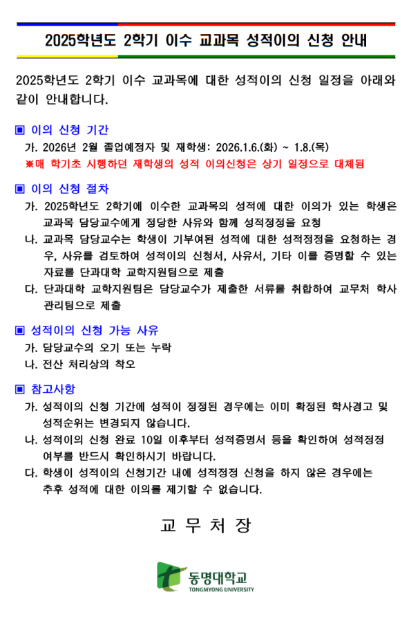 2025학년도 2학기 이수 교과목 성적이의 신청 안내