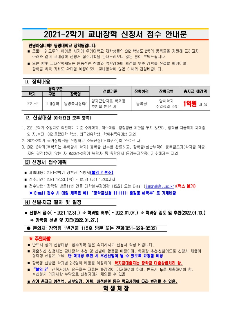 2021-2학기 동명복지장학C 대상자 추천을 위한 사전 장학금 신청서 접수 시행