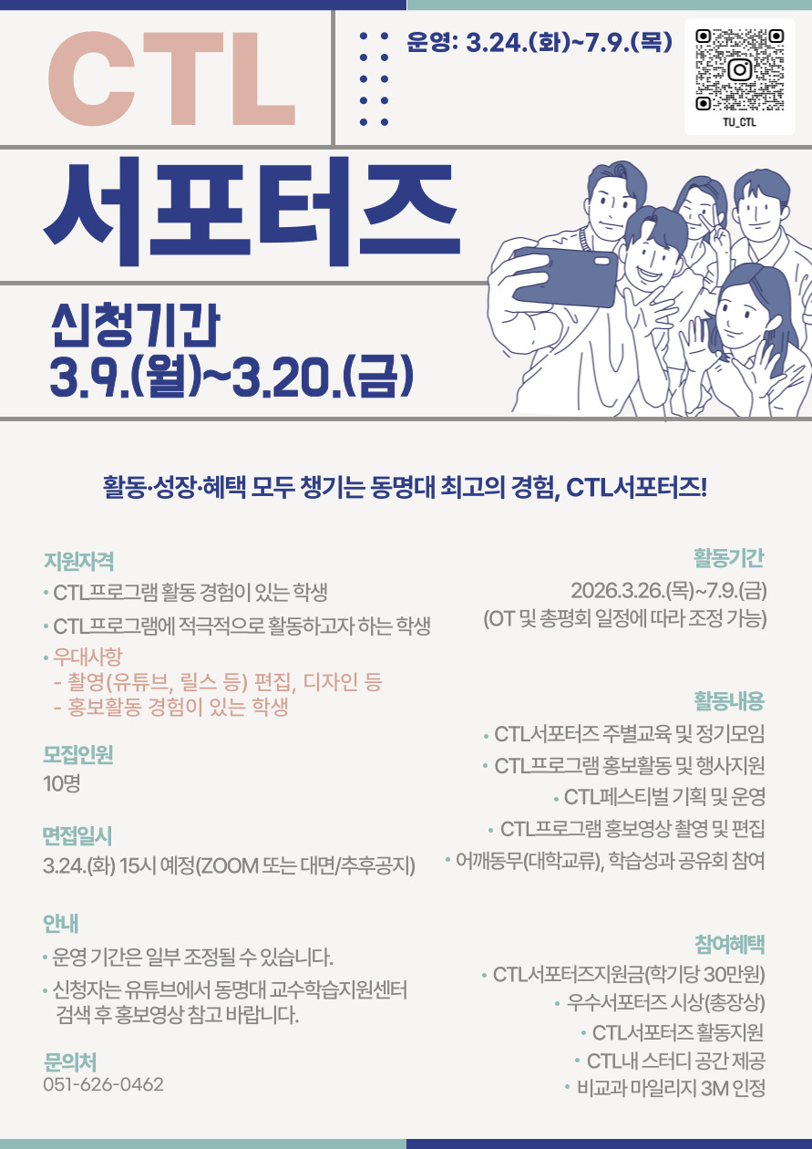 2026학년도 1학기 제25기 CTL서포터즈 프로그램 참여 학생을 아래와 같이 모집하오니, 많은 참여 부탁드립니다.